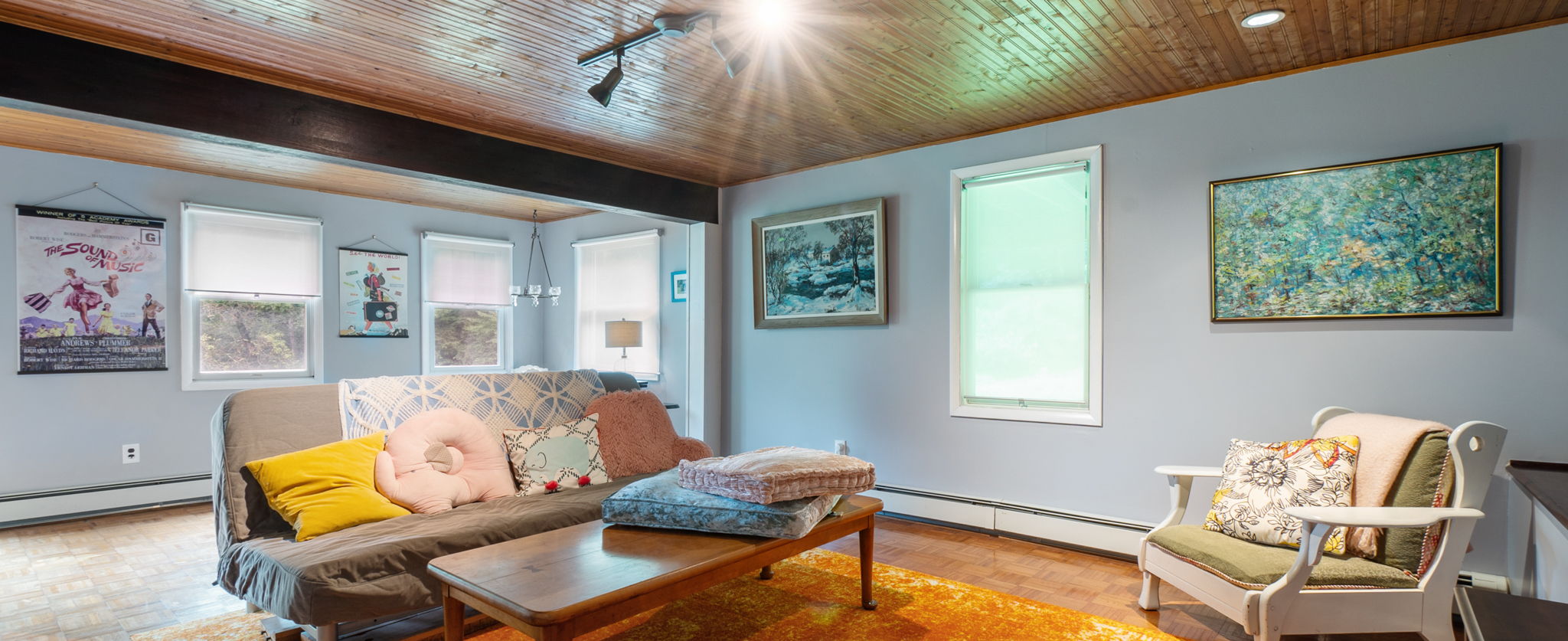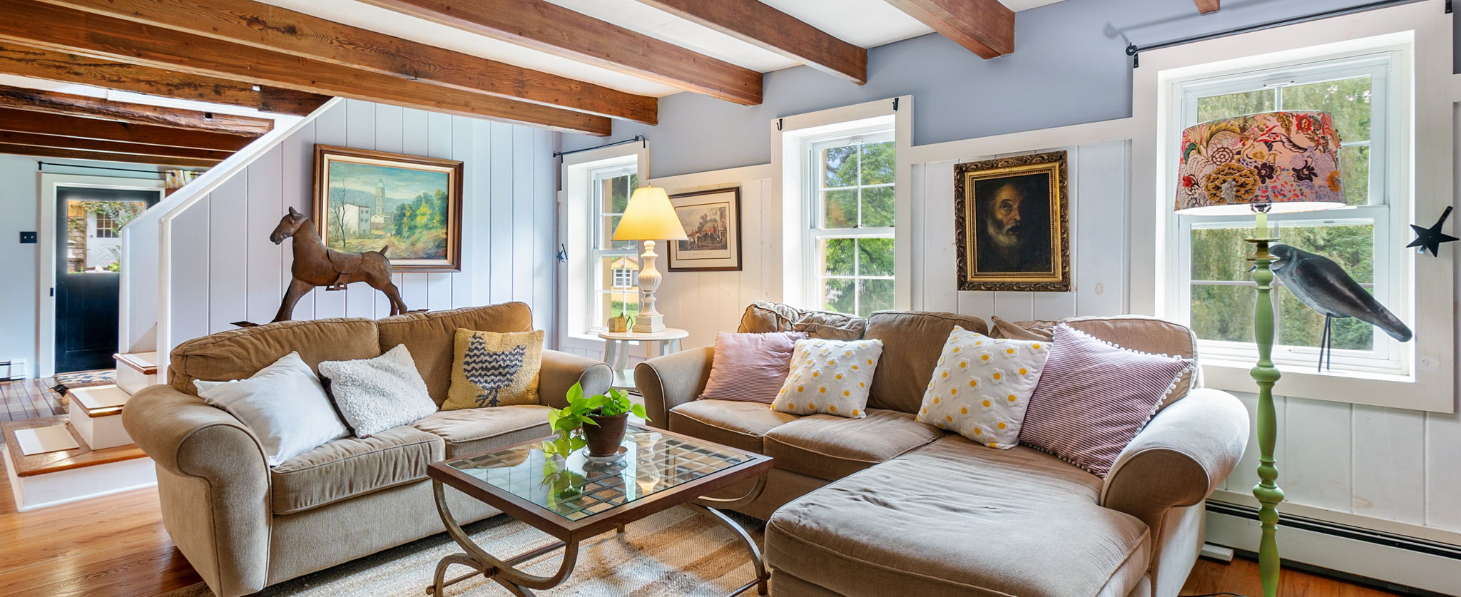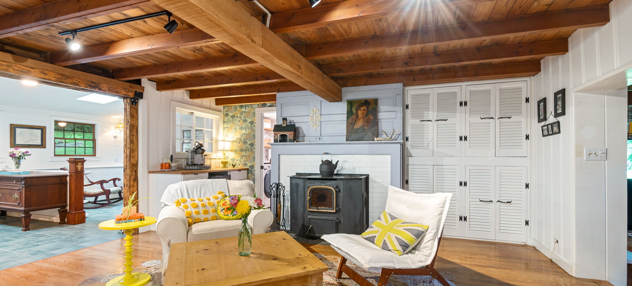 The hardwood floors and wood beamed ceilings provide an inviting rustic feel.